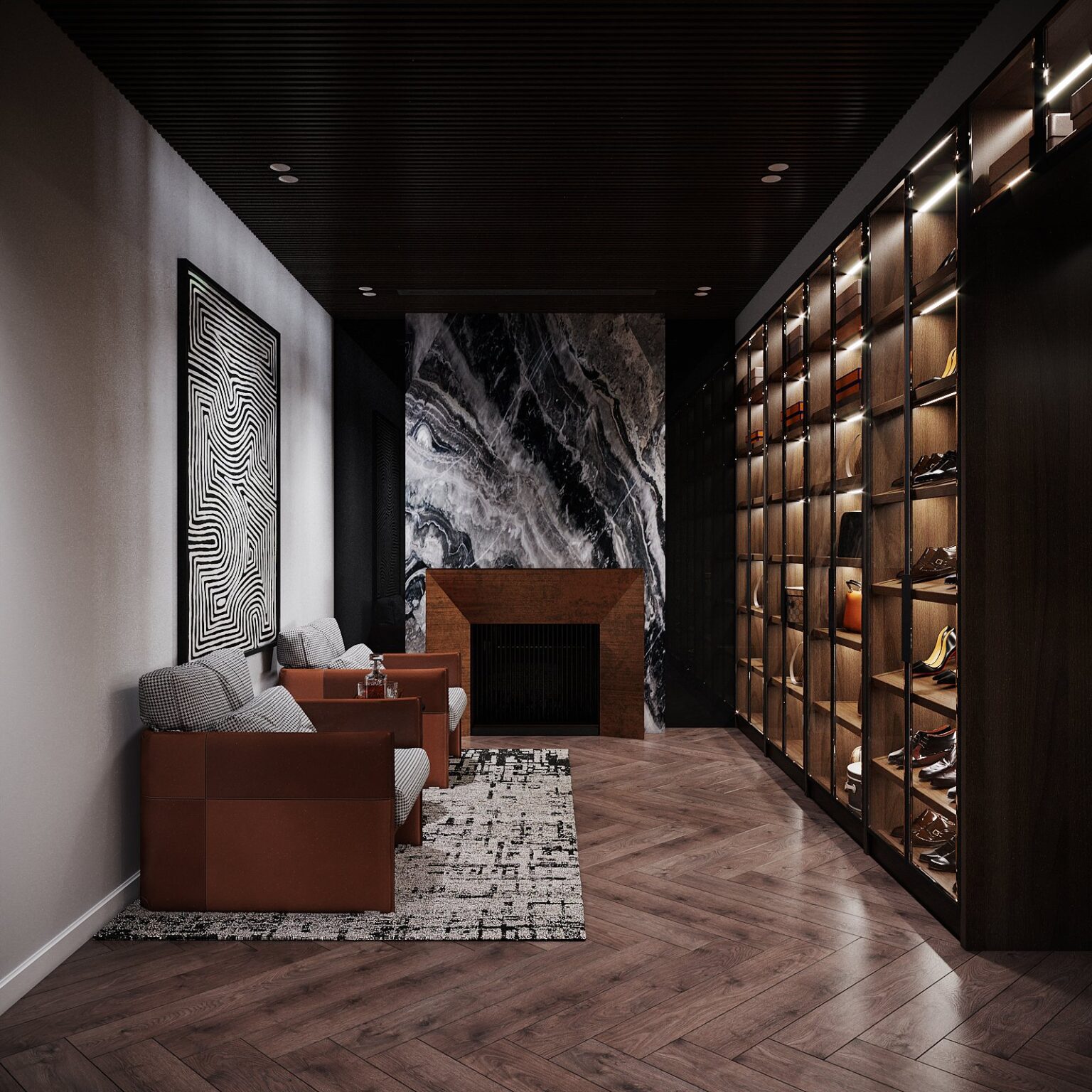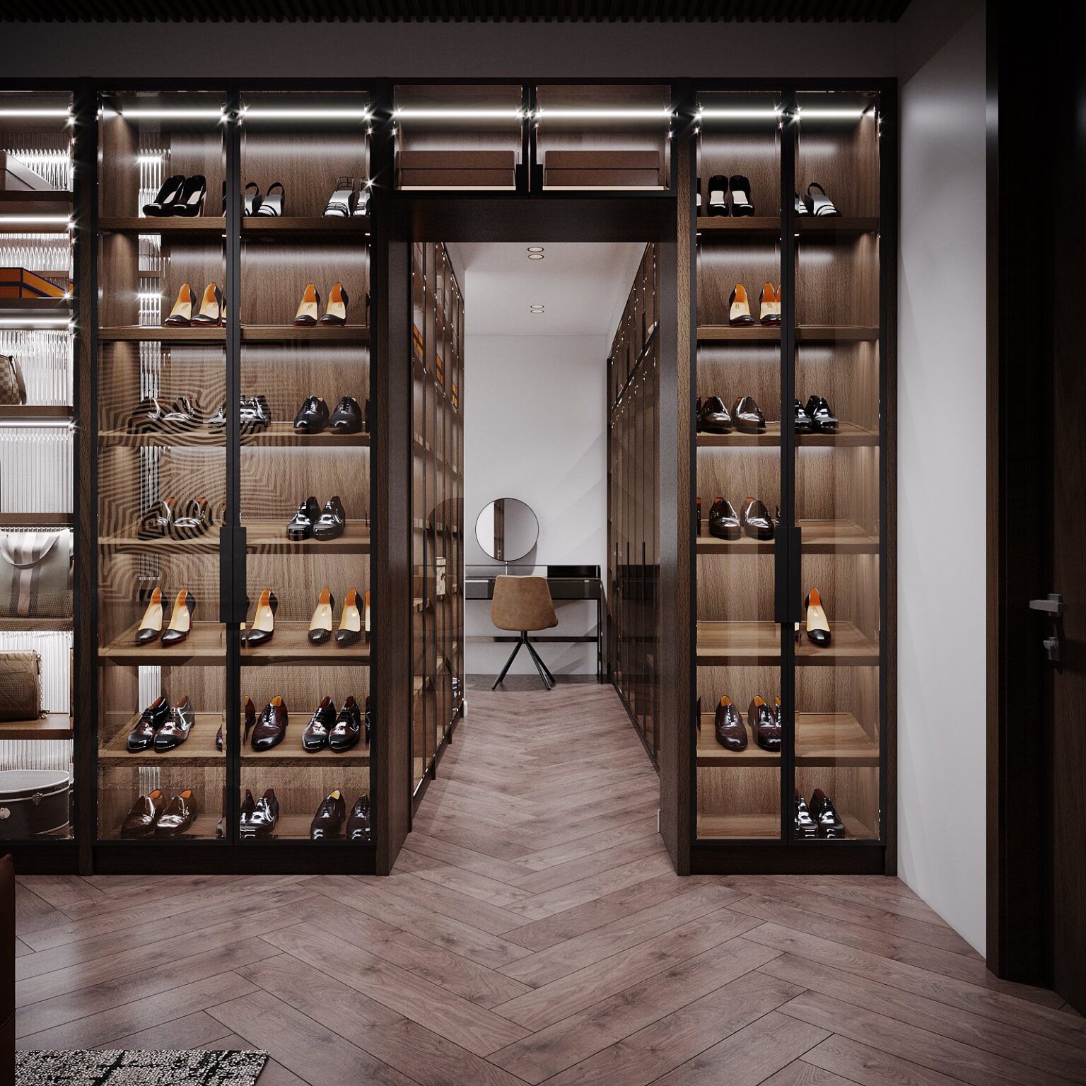 Shoe racks with integrated LED lights like gentle light strips illuminating each pair of shoes. Making the selection easy and still full of art. Like entering a mini showroom. Glass cabinets displaying jewelry and watches are separated. Both to protect and to enhance the value of the items. Making them like treasured gems.