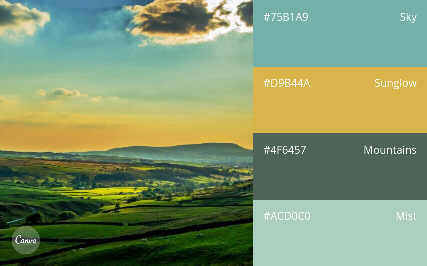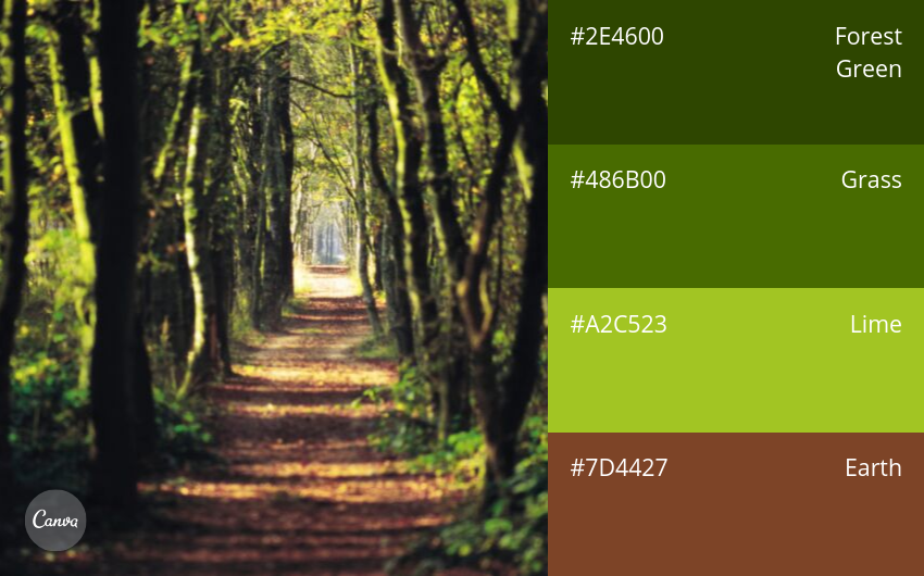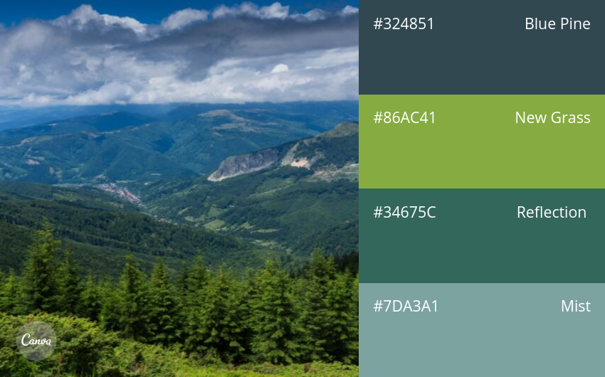 A natural green color palette unfolds a vibrant ecological panorama, where each shade tells its own story of nature and human emotion. The harmonious blend of forest green, sky blue, water blue, and grayish-blue creates a multi-layered space that is both profound and refreshing, offering a sense of openness, balance, and ultimate relaxation.